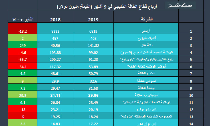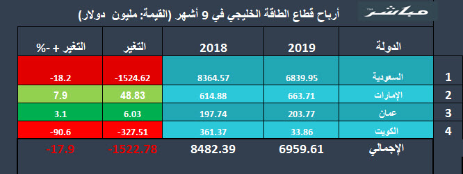 وأظهرت إحصائية لـ"مباشر"، تستند لإفصاحات الشركات على البورصات المحلية المدرجة فيها ضمن قطاع الطاقة، تحقيق 26 شركة خليجية مدرجة، أرباحاً بقيمة 69.59 مليار دولار خلال فترة التسعة أشهر الأولى من العام الجاري، مقابل أرباح بلغت 84.82 مليار دولار خلال نفس الفترة من عام 2018.